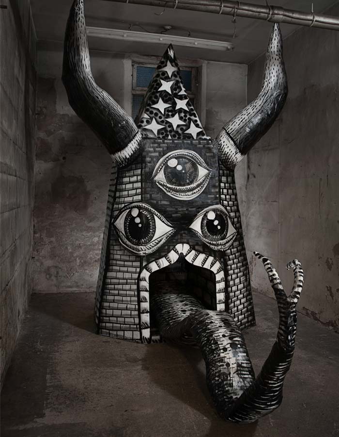 With the huge sculptures are placed in the halls, corridors and rooms of the factory, ‘Mausoleum of the Giants’ is an example of Phlegm’s surreal and unique work.