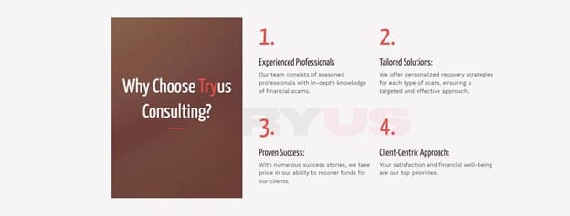 I will conclude this tryusconsulting.com review by saying that this funds recovery agency knows the ins and outs of getting funds back from fraudulent parties. They create tailored strategies that suit your particular case, increasing the likelihood of retrieval significantly.