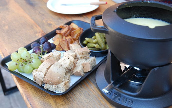 However, the main event when it comes to food offerings, the pièce de résistance if you may, are the fondue pots – a mouthwatering blend of melted cheese served in a large cast iron pot. For dipping you’ll receive fresh bread, potatoes and pickles (don’t knock it ‘til you’ve tried), but there’s also the option to add a meat or veg board so you can really make it a feast. For those who don’t have dairy products, there’s vegan fondue on offer so nobody gets left out.
