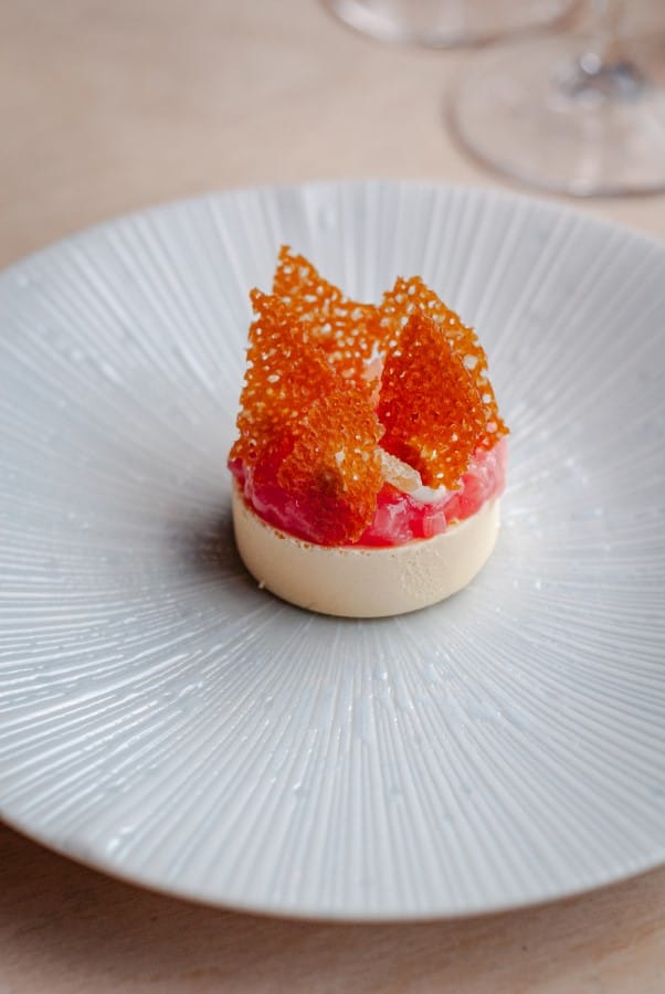 A pre-dessert of chocolate namelaka – Japanese for “ultra-creamy” and, fittingly, almost impossibly smooth – hides a core of miso caramel, finished with torched black sesame for a subtle smokiness. It’s a small dish but one that lingers.