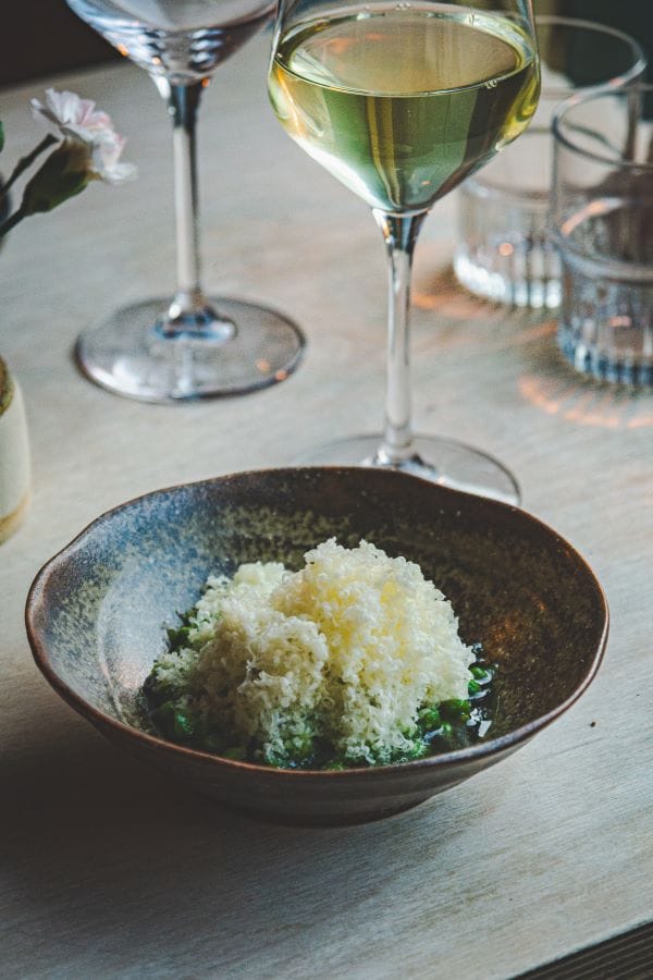 Next, Yorkshire peas cooked in lardo arrive with pickled girolles and a generous snowfall of grated Wakebridge cheese – somewhere between a Pecorino and something more local in character. Nasturtium herb oil cuts through with a peppery lift, bringing brightness to what could otherwise lean too heavy. It’s a delicious, delightfully earthy dish.