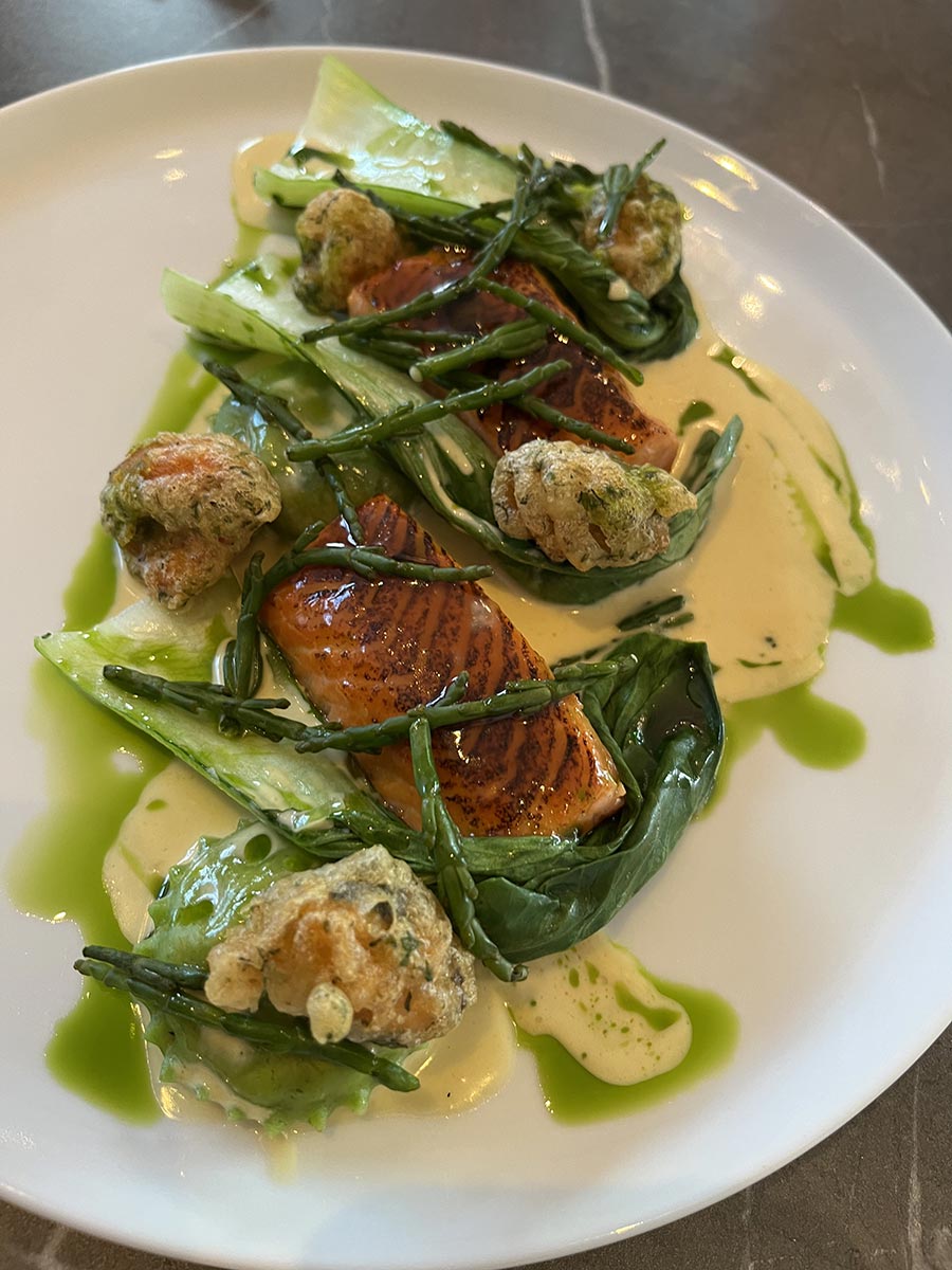 Appetites well and truly sharpened, we dived into our mains. My miso caramel glazed sea trout arrived looking nothing short of delectable. There was a lot to register amidst the mouthwatering presentation: two generous fillets of fish served on a bed of pak choi, tempura batter mussels, creamy pieces of prawn and wasabi ravioli, an umami-rich dashi sauce, all topped with salty samphire stalks. If it was a lot to take in visually, the taste experience provided an absolute rollercoaster experience of combining flavours – one that I’d gladly jump on again and again.