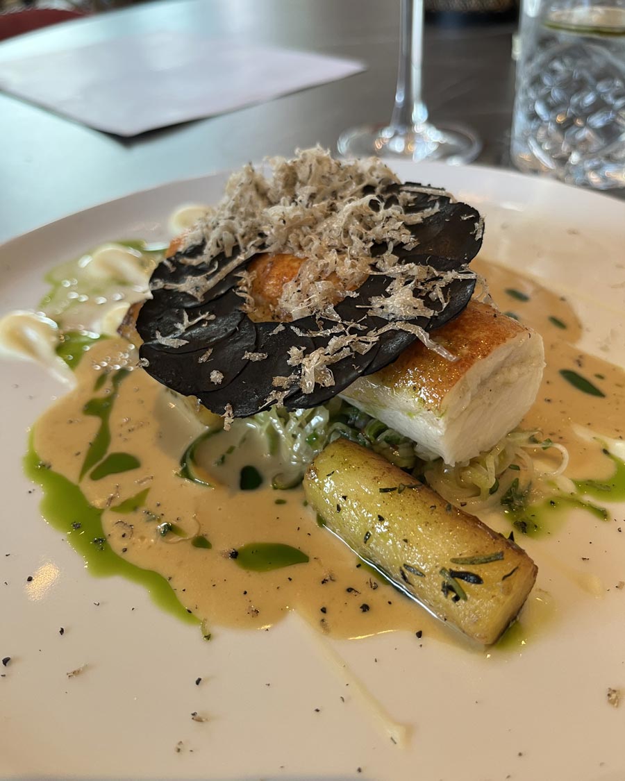 My partner’s plaice fillet arrived looking equally resplendent. The plaice was topped with squid ink pomme maxim (fancy potato chips, basically) and shaved truffle, supplemented by leeks and potato fondants beneath. This delightful bundle of food was accompanied by black truffle mousse and a white onion and thyme puree, which was swiftly declared exquisite. The delicate fish was a great pairing which allowed the more complex, rich flavours to come through and the portion size just right to keep us looking forward to dessert.