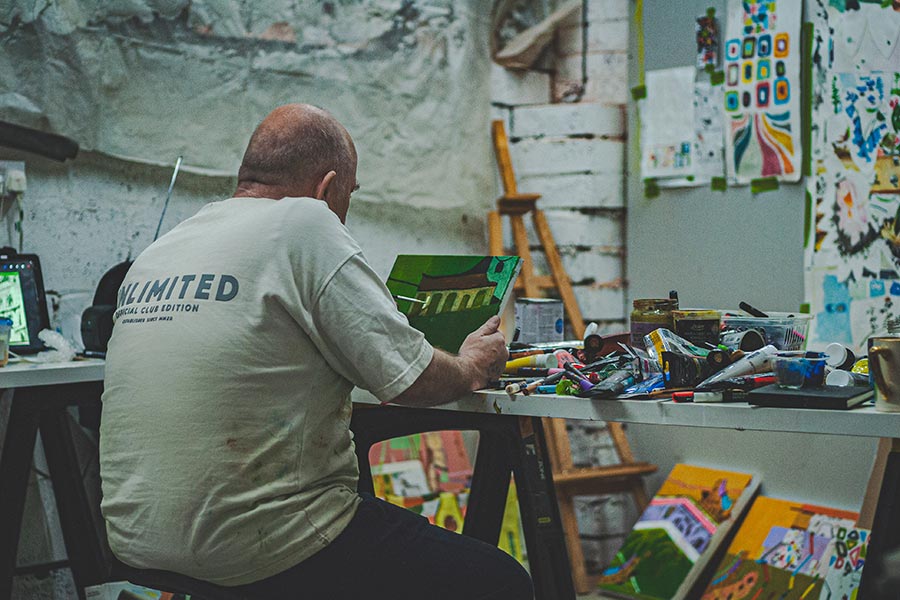 Each studio felt like stepping into a different character’s mind. At one stop, a huge canvas splattered with colour stood out – the work of Julian Wright. “Julian,” Kieran told me, “he’s a lawyer who spends a lot of time in London. I always think it’s quite interesting that someone who spends a lot of time in a suit comes in and paints in this style.”